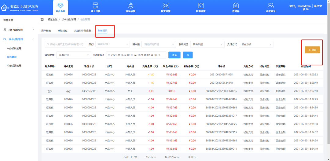 ①賬單記錄,可輸入用戶工號、名稱、卡號,篩選支付賬單類型查詢消費(fèi)記錄。