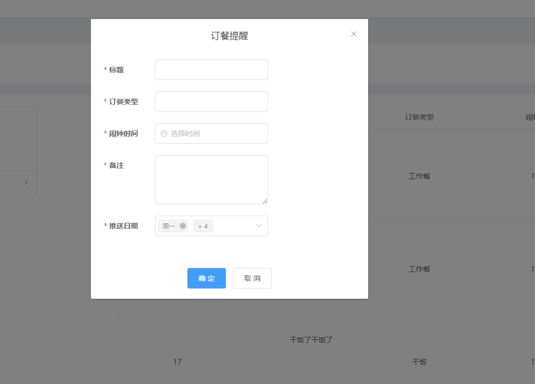 ①點擊“添加”按鈕添加標題、訂餐、類型、鬧鐘時間、設置推送日期等信息;