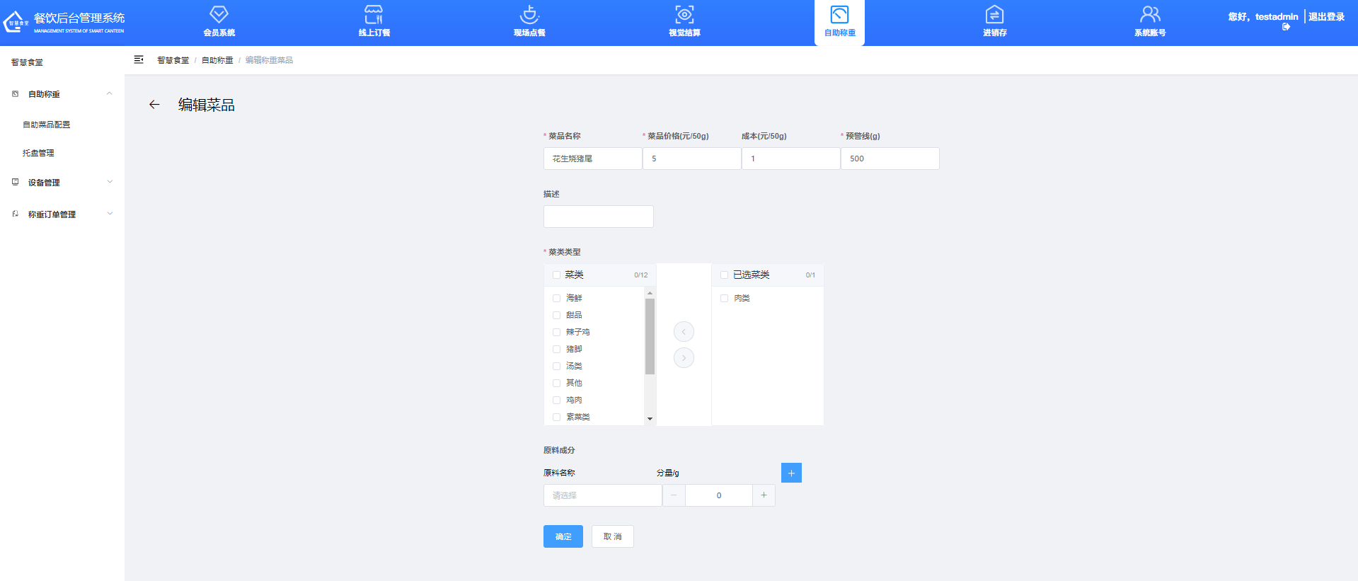 ②選擇計價方式,并輸入菜品名稱、菜品價格、菜品成本、預(yù)警線、描述等信息。③選擇菜品所屬的分類,選擇菜品搭配的配料。