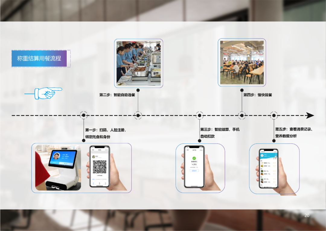 就餐者可以使用微信掃描智能秤上的二維碼即可綁定托盤,以輕松實(shí)現(xiàn)自助就餐。就餐者還可以查看消費(fèi)賬單、營(yíng)養(yǎng)報(bào)告、交易記錄等功能操作;人臉綁定,無(wú)需排隊(duì);自助售賣,改善用餐體驗(yàn),吃多吃少我做主,提升用餐滿意度;餐后查收膳食報(bào)告,均衡營(yíng)養(yǎng)攝入。