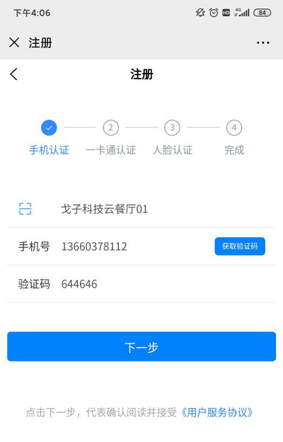 Ps:點擊“跳過”按鈕可以直接進入系統(tǒng)頁面,但無法進行訂餐支付。跳過后可在“我的”頁中“卡號綁定”進行再次綁定。