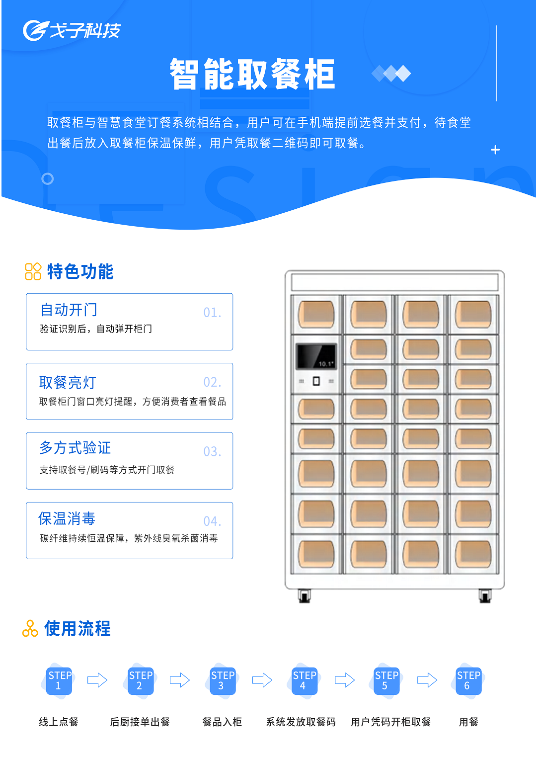戈子科技智能取餐柜有保溫、加熱、制冷、消毒等多種功能,可以分散放置在食堂、員工辦公區(qū)內,緩解員工排隊擁擠,工作忙沒有時間去食堂取餐問題。訂餐人員根據收到的取餐二維碼在餐柜掃碼自提,簡單方便,隨時都可吃到的飯菜。