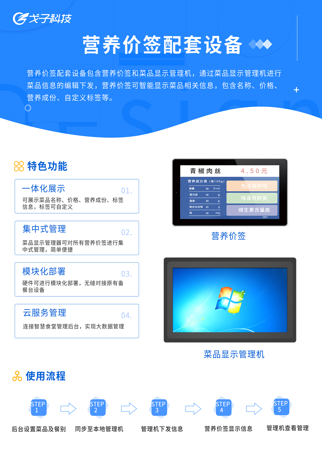戈子科技的電子菜價(jià)標(biāo)簽主要是嵌入在智能備餐臺(tái)內(nèi),將展現(xiàn)對(duì)應(yīng)菜盆售賣菜品的品名、價(jià)格、營養(yǎng)標(biāo)簽和營養(yǎng)成分等情況。