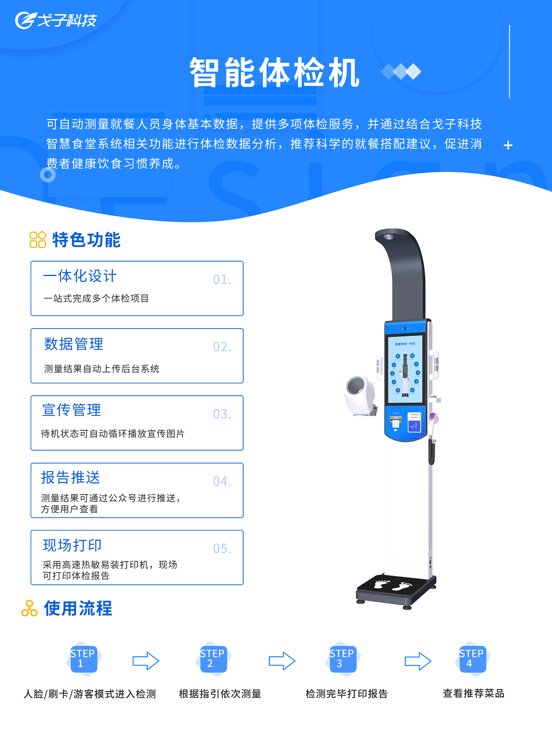 可自動測量就餐人員身體基本數(shù)據(jù),提供多項(xiàng)體檢服務(wù),并通過結(jié)合戈子科技智慧食堂系統(tǒng)相關(guān)功能進(jìn)行體檢數(shù)據(jù)分析,推薦科學(xué)的就餐搭配建議,促進(jìn)消費(fèi)者健康飲食習(xí)慣養(yǎng)成。