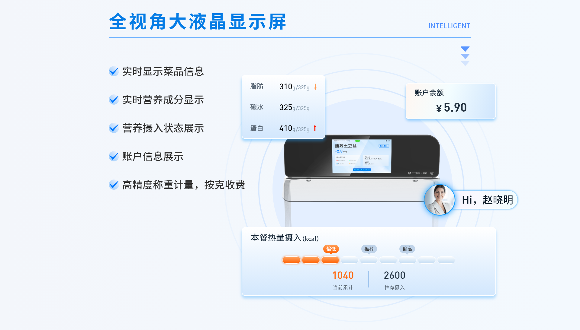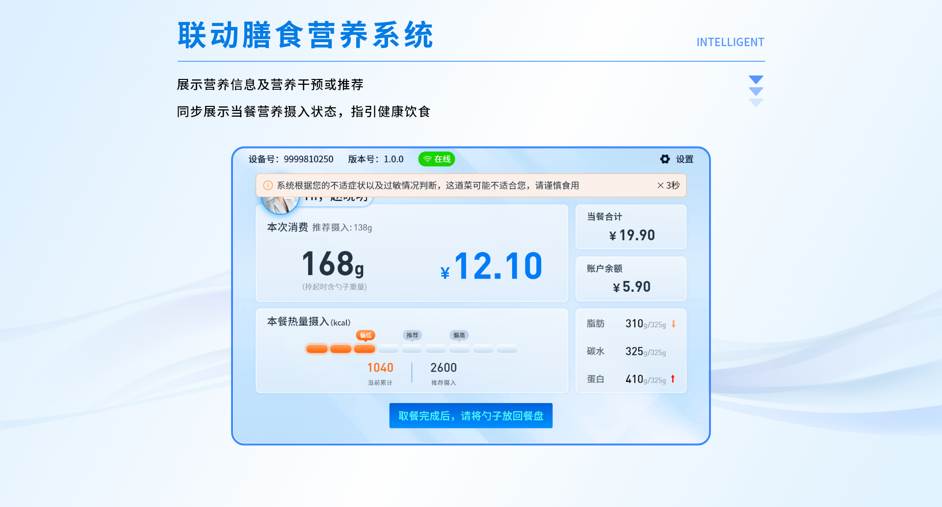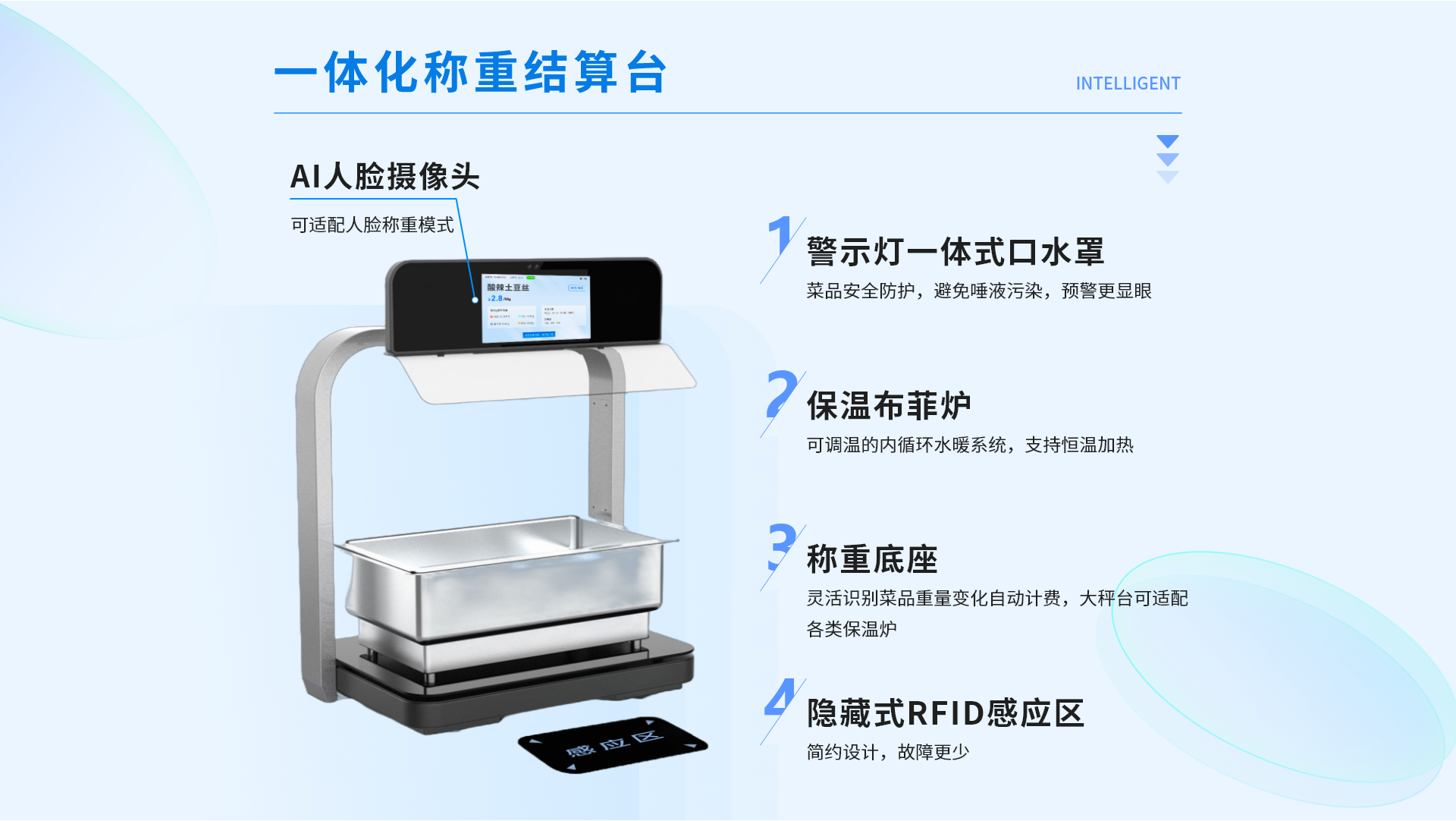 智能稱重結(jié)算臺(tái)一體化設(shè)計(jì),基于餐飲云平臺(tái)為就餐者提供的無(wú)感支付、自助餐飲的智能化集成式系統(tǒng)。用戶綁定托盤(pán)后,通過(guò)托盤(pán)感應(yīng)臺(tái)讀取托盤(pán)信息,即可在多個(gè)智能秤上自助稱重取餐,取餐完成后通過(guò)空中支付進(jìn)行就餐結(jié)算。