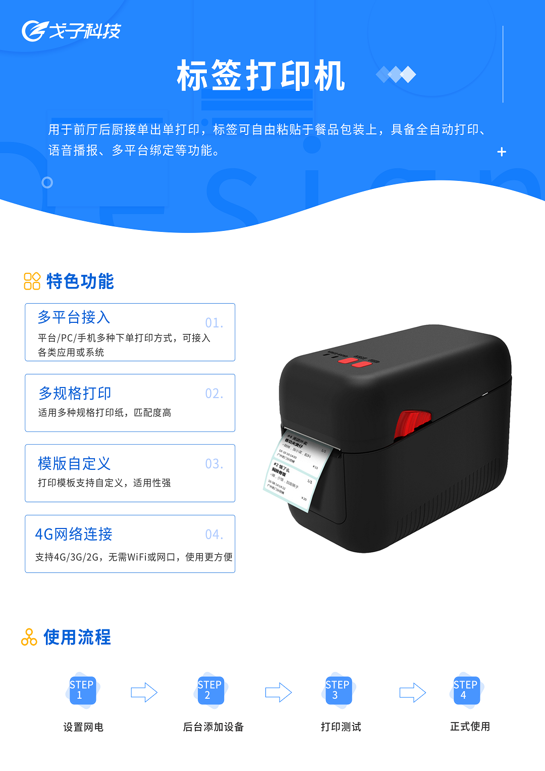 用于前廳后廚接單出單打印,標簽可自由粘貼于餐品包裝上,具備全自動打印語音播報、多平臺綁定等功能。