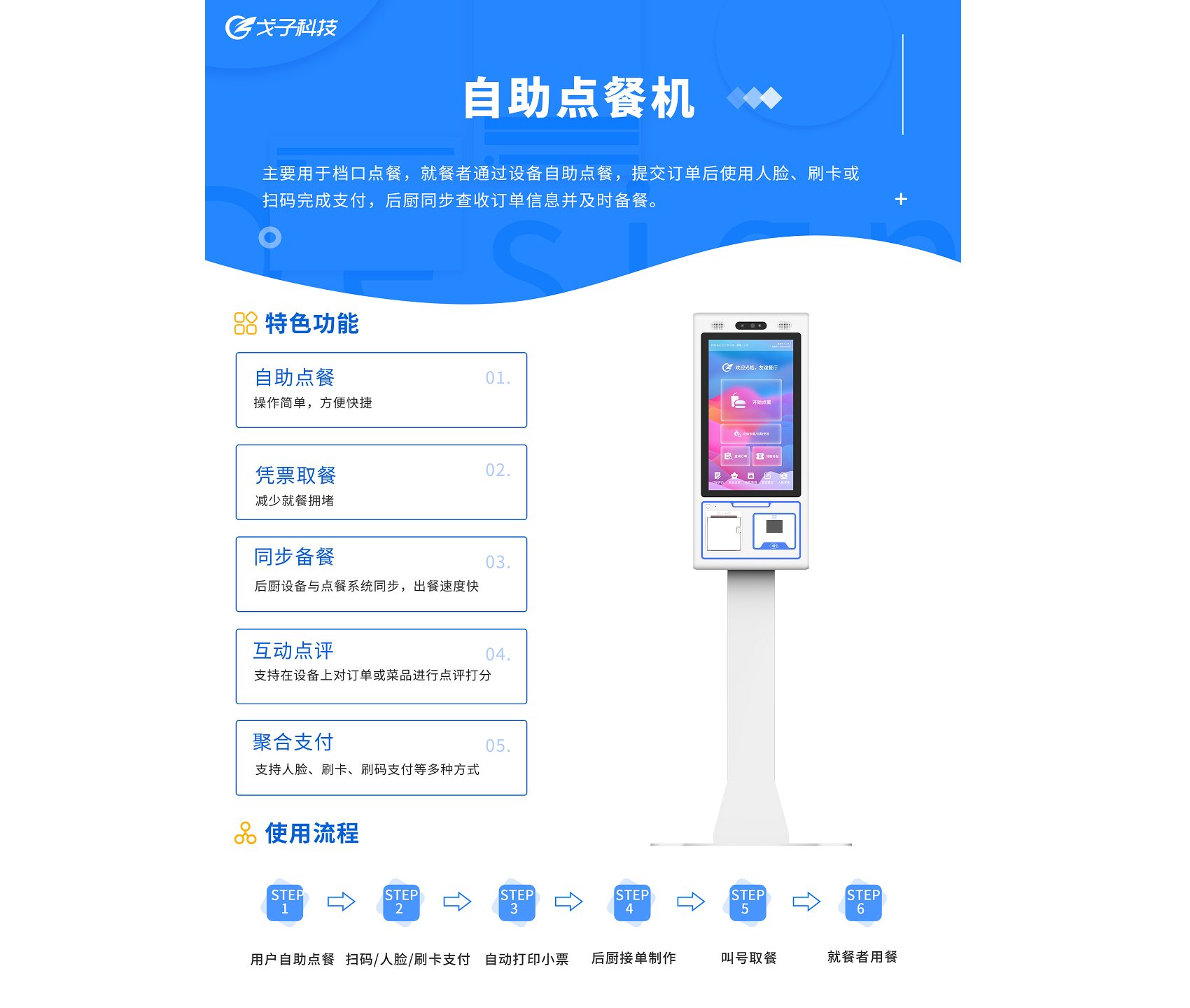戈子科技自助點(diǎn)餐機(jī)有效利用自助點(diǎn)餐系統(tǒng)搭合理搭配叫號取餐系統(tǒng),人臉收銀等設(shè)備硬件,無縫整合智慧餐廳的前端硬件和軟件,后廚系統(tǒng),實(shí)現(xiàn)對餐廳的集成化智能管理。